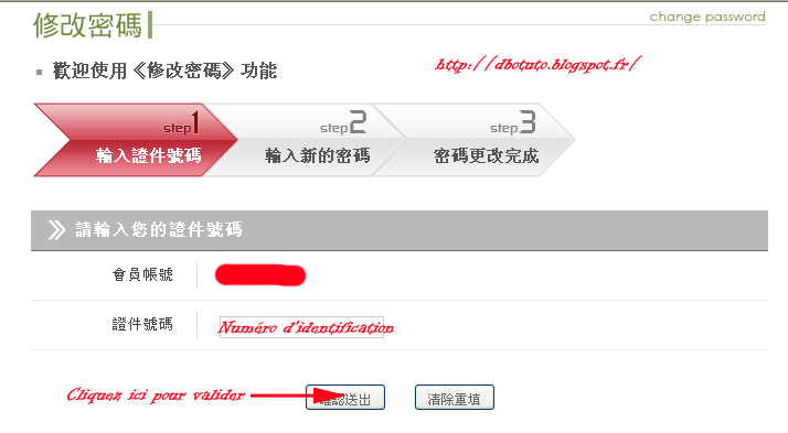 身分證字號 (Numéro d'identification) : Entrez un numéro d'identification. Il s'agit du code qui vous permet de réinitialiser votre mot de passe. Afin de ne pas vous faire pirater, choisissez un numéro avec des chiffres et des lettres (ex. : 23df57 -> ne prenez pas ce code !). Evitez les "1234" ou autres. Ce numéro est aussi important que votre mot de passe. ATTENTION : notez-le bien car vous ne pourrez plus le changer !!!